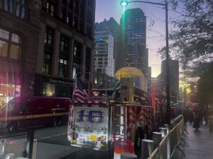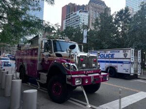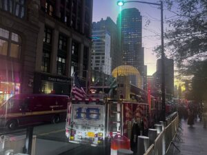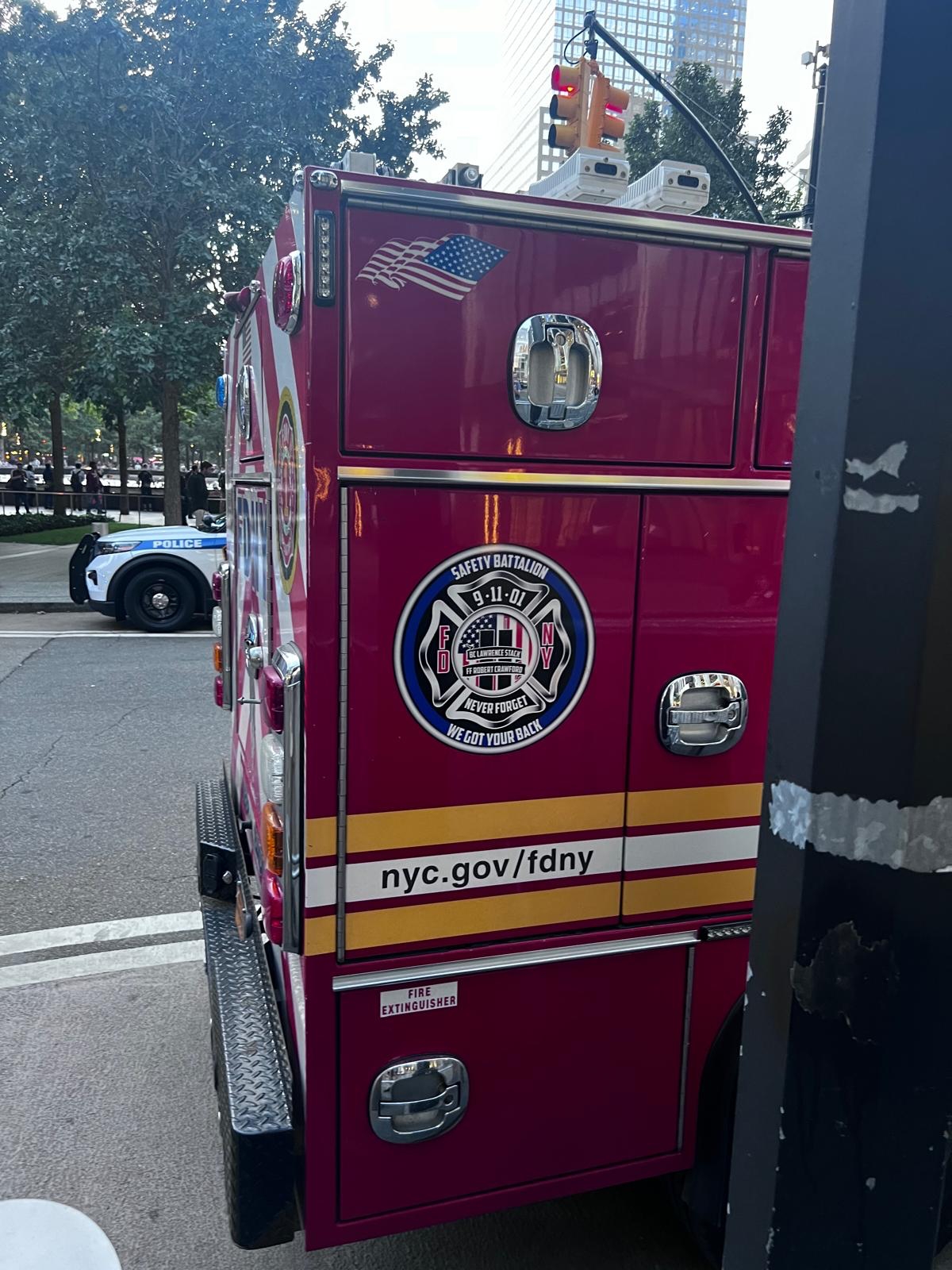 Fotka stanice s nápisem FDNY nad vraty a označením Ladder 10 / Engine 10 je tzv. Ten House na 124 Liberty Street, přímo naproti památníku. Byla první, kdo na WTC vyjížděl, a má vlastní pietní stěnu.